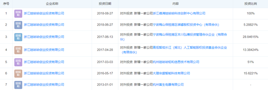 實際上,娃哈哈創(chuàng)投成立已有十余年。根據(jù)公開資料顯示,娃哈哈創(chuàng)投早在2010年11月8日就已成立。從2016年至今,娃哈哈創(chuàng)投共進行過6次對外投資,包括投資寧波梅山保稅港區(qū)祺睿股權(quán)投資中心、高瓴智成長江人工智能股權(quán)投資基金合伙企業(yè)等。