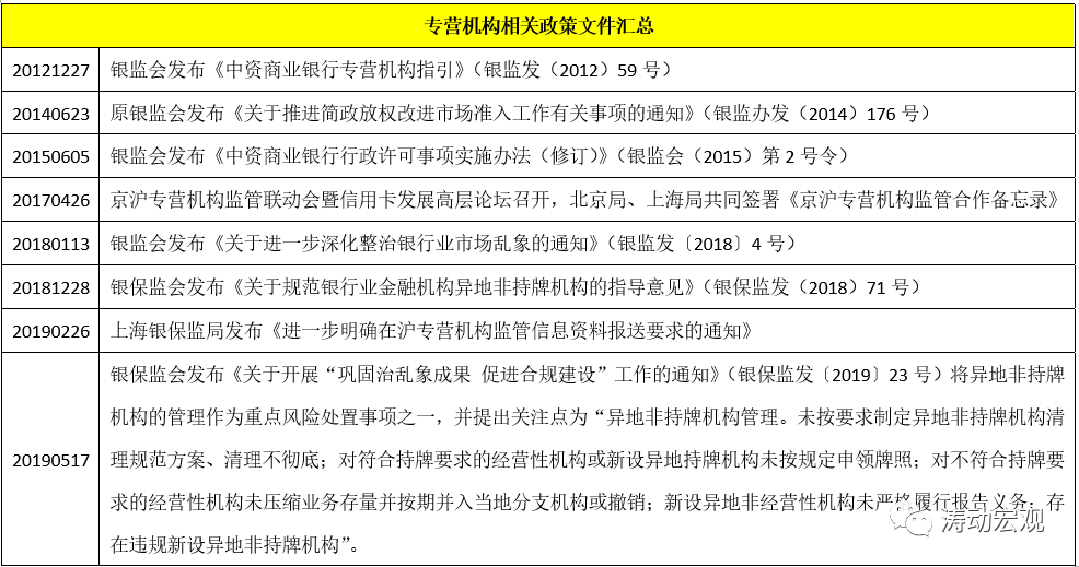1、2017年后,監(jiān)管環(huán)境開始明顯趨嚴,監(jiān)管部門整體上貫徹了“開正門、堵偏門”的政策思路,對異地非持牌機構(gòu)進行清理整頓,同時亦批籌一些合規(guī)的專營機構(gòu),此時獲批的專營機構(gòu)基本上均有兩個條件,一是母行所在地監(jiān)管環(huán)境較為友好,二是擬籌建專營機構(gòu)所在地有分支機構(gòu)且運營兩年以上。
