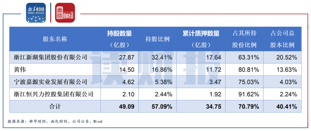 截至2021年9月4日,公司大股東新湖集團、黃偉、寧波嘉源、恒興力控股累計未解押股權(quán)質(zhì)押數(shù)量為34.75億股,合計占其所持股份的70.79%、占公司總股本的40.41%。