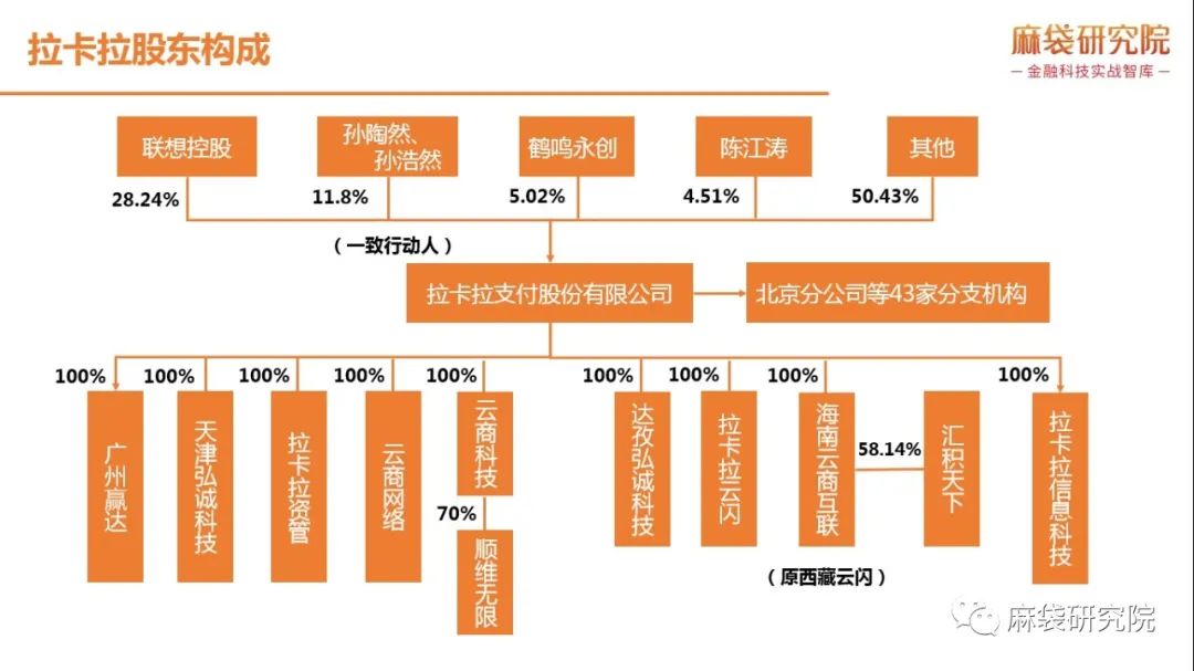 聯(lián)想控股為拉卡拉的第一大股東,持股比例28.24%,公司無實際控制人。法定代表人為孫陶然,與一致行動人孫浩然共同持股11.8%。