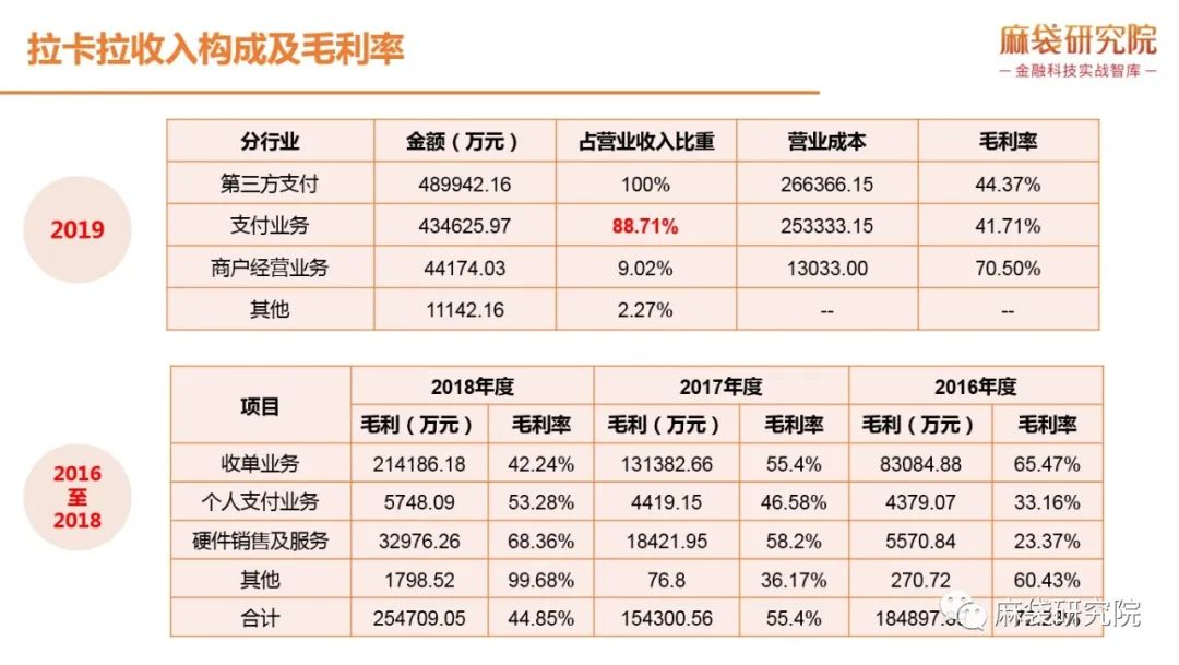 支付起家的拉卡拉,主營業(yè)務是為實體小微企業(yè)提供收單服務及為個人用戶提供支付服務,屬于第三方支付服務,核心盈利模式是通過向商戶提供收單業(yè)務收取手續(xù)費及通過為個人提供支付服務收取手續(xù)費。