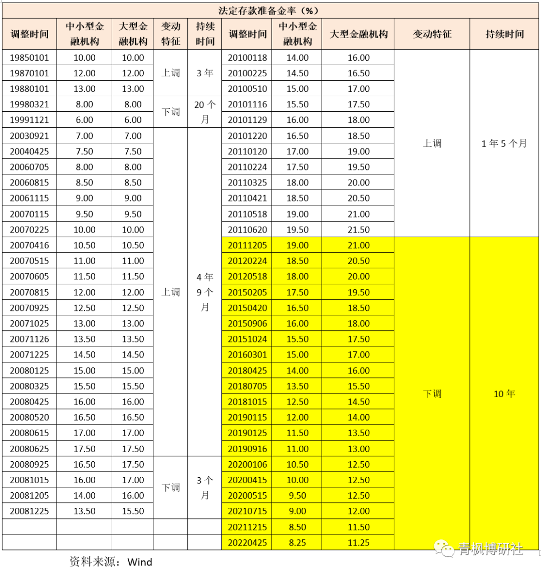自1985年我國實行法定存款準備金制度以來,我國存準率共調整60次,其中2007年以前調整10次、2007年以來調整50次。特別是,自2011年起,我國便已進入降準的長周期中,且這個周期已持續十年以上。