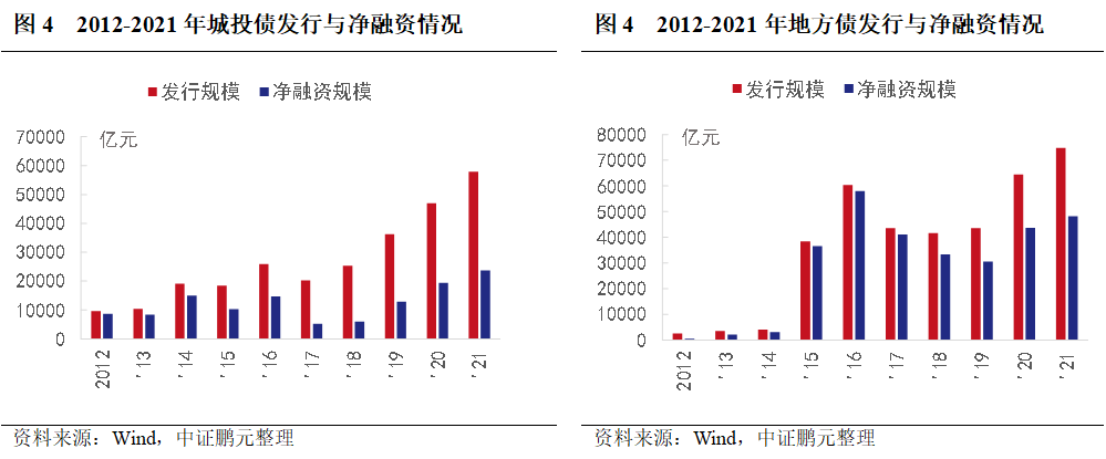 具體看2021年的重要政策和市場表現:第一,再融資債券發行放量,城投債提前到期兌付。2021年地方再融資債發行規模合計為3.12萬億元,較2020年的發行規模(1.89萬億元)明顯增多。不完全統計,2021年涉及到募集資金用途變為“償還政府存量債務”的再融資債8,170億元,其中,北京、廣東和重慶分別為1,921億元、1,121億元和500億元,位列前三。受此影響,2021年城投債提前兌付情形增加。第二,城投發債門檻上升。2021年初交易所和交易商協會相繼對城投債發行進行分類管理,根據財政部對地方政府債務風險劃分的等級,對于紅色檔暫停發放批文、黃色檔只能借新還舊、綠色檔用途不受限制。2021年6月閃現的銀保監會15號文,進一步明確了當前隱性債務化解的主旋律。第三,重提財政重整和城投破產重整/清算。2021年4月,國務院公布的《關于進一步深化預算管理制度改革的意見》中,提出“清理規范地方融資平臺公司,剝離其政府融資職能,對失去清償能力的要依法實施破產重整或清算”, 12月鶴崗市政府公告實施財政重整計劃。財政重整和城投破產重整/清算均非首次提出,在2021年重提,體現了化解存量債務風險的決心以及化解難度較大。第四,多地成立信?;穑苿訃蟾母?,加強債務風險分類管理。2021年來,天津、廣西、河南等地陸續成立省級信?;穑m州、濰坊等地成立市級信?;穑糜趪衅髽I債務風險化解。2021年包括城投公司在內的國有企業改革進程加快,明確央企債務不違約,建立地方政府債務風險管理機制,清理高息債務,調整債務結構。例如,8月河南省發布《關于加強省管企業債務風險管控工作的實施意見》明確,對納入債務風險重點管控名單的企業,要嚴格審核發行方案,并實施債券發行比例限制,原則上債券余額占帶息負債的比例不得超過30%, 一年內到期債券不超過債券余額的60%。當月福建省發布《關于加強所出資企業債務風險管控工作的實施意見》指出,要健全完善債務風險監測預警機制、建立債務風險量化評估機制、建立債務總規模動態管控機制,將債務風險突出的下屬企業納入重點管控范圍(高于本行業上年度規模以上全部企業平均資產負債率加5個百分點)。