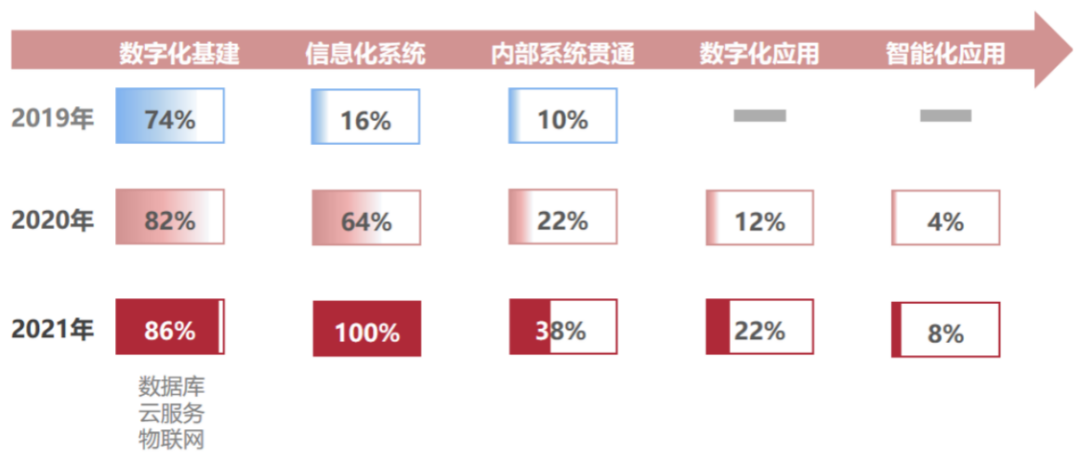 據(jù)克而瑞調(diào)研顯示,2019到2021的三年間,TOP50房企在數(shù)字化轉(zhuǎn)型方面投入資源與收效都顯著增加。其中,已健全數(shù)字化基建(數(shù)據(jù)庫(kù)、云服務(wù)和物聯(lián)網(wǎng)等數(shù)字化轉(zhuǎn)型基礎(chǔ)設(shè)施)整體建設(shè)的TOP50房企已接近 90%,且呈逐年上升態(tài)勢(shì),內(nèi)部基礎(chǔ)信息化系統(tǒng)完成比例更是達(dá)到了100%。