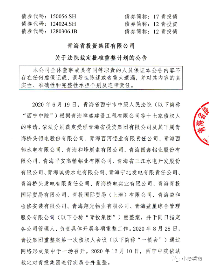 12月27日,青海省投資集團有限公司(以下簡稱:“青海省投”)公告稱,法院已裁定批準(zhǔn)《青海省投資集團有限公司等十七家企業(yè)重整計劃》,公司進入重整計劃執(zhí)行期間。