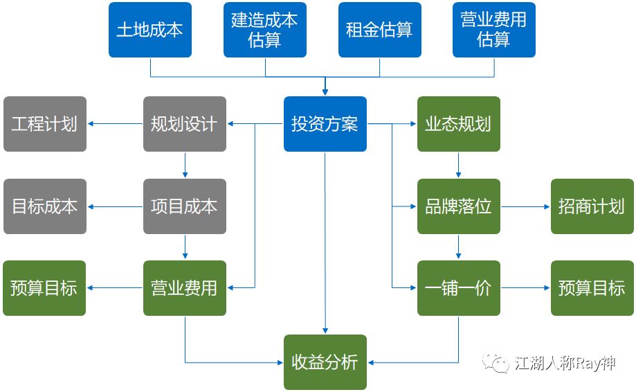 對于這一過程,行業(yè)內(nèi)通常會通過投策定案來進行管理,但往往出現(xiàn)的問題就是投策與運營脫節(jié),制定的目標無法在運營期落地。因此,問題的關鍵也就是在解決如何把投資方案與運營方案協(xié)同起來。以購物中心為例,這一協(xié)同就涉及到我們?nèi)绾芜M行業(yè)態(tài)規(guī)劃、品牌落位和一鋪一價的制定,進而落實到可執(zhí)行的招商計劃和預算目標上。
