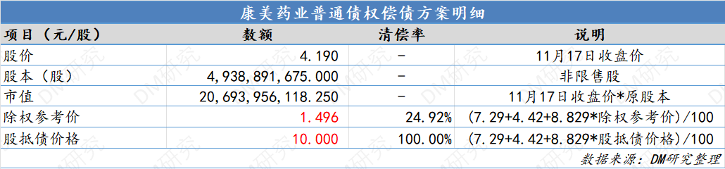 11月17日,康美藥業收盤價為4.19元,按照原始流通股4,938,891,675股來看,康美目前市值約206.94億元。按每10股轉增約18股后(送股率1.8),共計約8,890,005,015股,除權參考價為1.496元/股。然而,50萬元以上的普通債權償債計劃中股抵債價格為10元/股,股抵債價格過高,且未給出具體解釋,康美藥業市值需達到1300億元方能實現該股價,與目前事實存在較大出入。按10元/股股抵債價格,康美藥業對50萬元以上債權部分可達到100%清償;但若按照除權價格,清償率僅為24.92%。且該部分債權無其他償債方案選擇,或存在較大爭議。