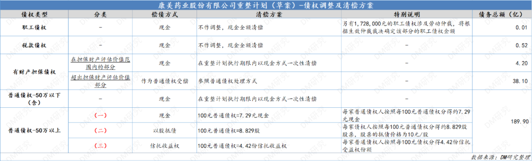 職工債權:在重整計劃執行期限內以現金方式全額清償,另有172.8萬元涉勞動仲裁,將根據生效仲裁確定該部分債權金額; 稅款債權:在重整計劃執行期限內以現金方式全額清償; 有財產擔保債權:擔保財產評估價值范圍內的部分,重整期間以現金方式一次性清償;超出擔保財產評估價值的部分作普通債權受償; 普通債權:以50萬元為界,分為兩種償債方式。 50萬元以下(含),由康美藥業在重整計劃執行期限內以現金方式一次性清償完畢; 超過50萬元的普通債權,以100元普通債權為單位,可獲得7.29元現金、8.829股及4.42份信托受益權。