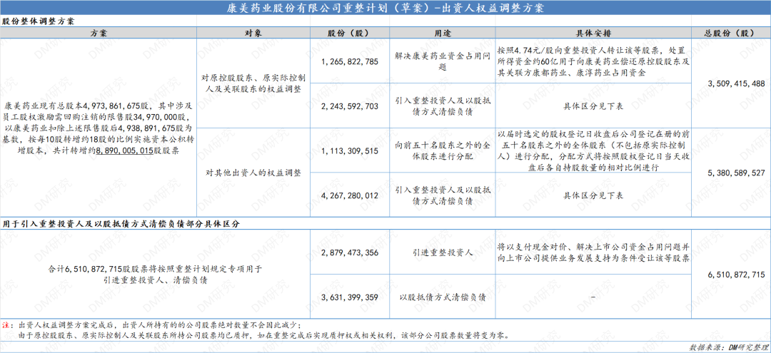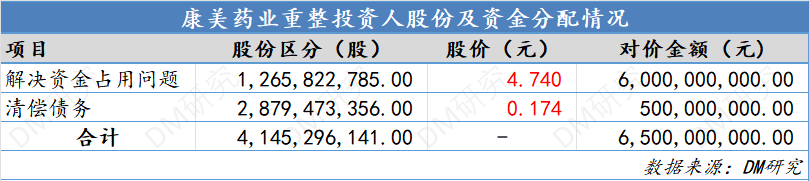 康美重整投資人為廣藥集團,根據《重整計劃(草案)》,應受讓4,145,296,141股轉增股票,占出資人權益調整后總股票數量的29.90%,并支付股票受讓總價款65億元。其中明確指出,1,265,822,785股專項用于解決康美藥業資金占用問題,按照4.74元/股向康美藥業的重整投資人轉讓該股票,處置所得資金60億元用于向康美藥業償還原控股股東及其關聯方康都藥業、康淳藥業占用資金。但剩余用于債務清償的2,879,473,356股僅對應5億元,即每股價格約為0.174元,與前述4.74元/股相去甚遠,股票定價存在明顯不合理,對投資人利益有一定的損害。