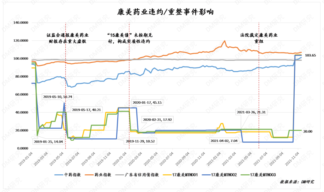 從中藥及整體藥業影響程度來看,中藥板塊指數及整體藥業板塊指數2019年受康美藥業事件影響較大,2020年1月后即恢復正常。主要原因是,作為中藥龍頭企業,康美債券存量規模較大,在行業中占比較高,故對中藥板塊及藥業板塊整體表現產生一定影響。而實際上,康美的違約及重整相關事件主要因為財務造假,有其特殊性,并非行業整體沖擊,也與行業周期性無關,故行業波動恢復較快。從廣東省信用債影響程度來看,廣東省信用債指數長期保持較為平穩表現,并未受到康美事件影響。故整體來看,康美事件并未對行業及地區造成較大影響。