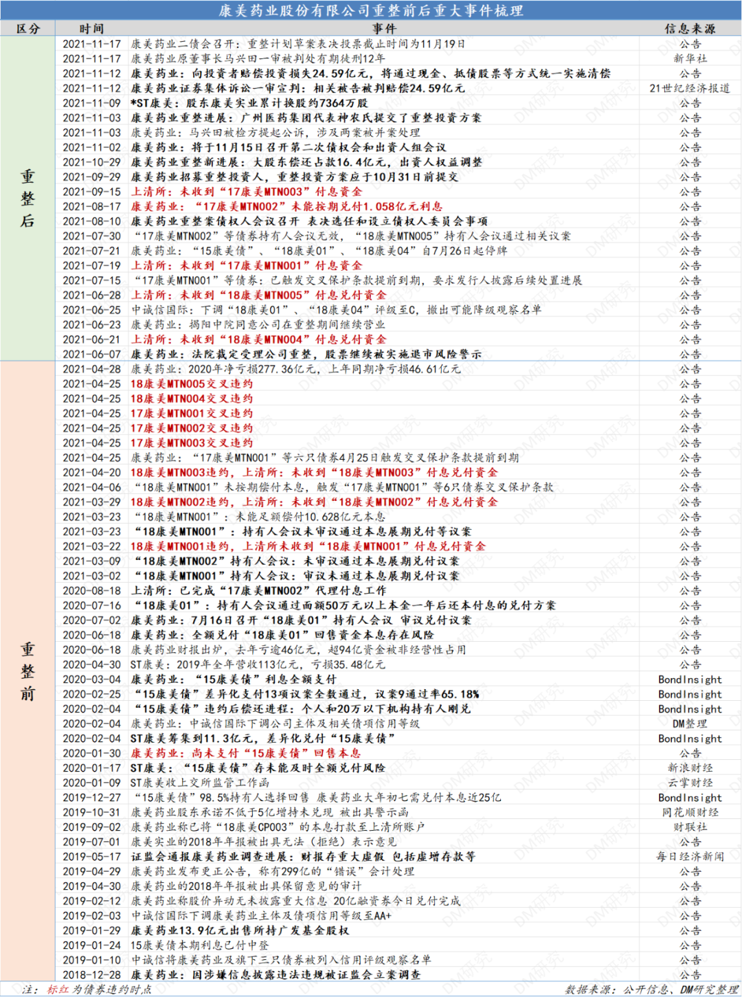 自2018年12月28日,證監會對康美藥業立案伊始,公司股票一字跌停,債券同樣下跌,2019年初債券價格已落至70-95區間;2019年1月,各類負面輿情不斷發酵,中誠信將其展望下調為負面,康美為解決現金流問題出售“奶牛”廣發基金股權等;2019年1月25日,債券價格觸底,最低跌至14.04元。此后,由于公司經營面回穩,且按期兌付了“18康美CP003”,使得債券價格有所回升,2019年5月10日上漲至50元左右。2019年5月17日,證監會通報公司調查進展,坐實其財務造假等惡劣行徑;2019年5月21日,由“康美藥業”變更為“ST康美”,債券價格再度跌至冰點。熬過了2019年,2020年1月31日,公司未按期支付“15康美債”形成實質性違約,彼時公司仍積極償債,籌集到11.3億元差異化兌付了“15康美債”。2021年3月,公司“18康美MTN001”、“18康美MTN002”持有人會議未通過展期議案后開始一路“躺平”,截至目前公司累計違約債券金額134億元,具體明細如下: