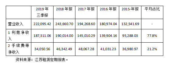 LPR改革對融資租賃行業的影響將是比較全面的,因為定價問題是一個公司競爭力的體現,也是競爭的手段。目前融資租賃公司的息差收入占到全部收入的80%左右,所以不管是資產端還是負債端,其成本和定價的高低與租賃公司的盈利和資本回報是休戚相關的。更何況,租賃公司的手續費收入基本上也是租賃定價的可替代部分,這個收入與利息凈收入合起來就是租息定價,就是我們要講的租賃公司定價的范圍。這兩部分收入幾乎占租賃公司營業收入的全部。舉例來說,江蘇租賃2015至2019年三季報的營業收入中,平均的利息凈收入占77.8%,手續費等收入占21.2%,兩者合計占99%(見表2)。