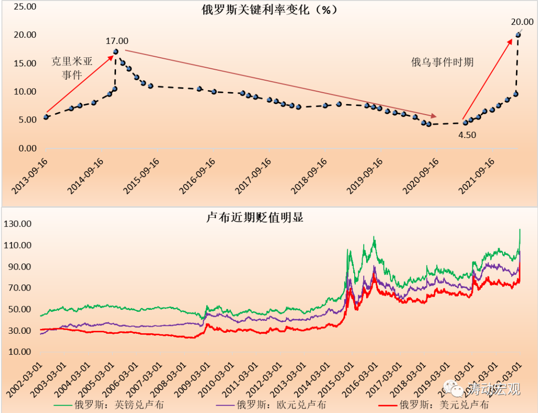 二、此次大幅上調關鍵利率的背景是,俄烏沖突升級導致俄羅斯貨幣大幅貶值、證券市場大幅波動以及跨境資金異常流出所致,因此上調關鍵利率的用意在于防范跨境資金大規模流出和國內金融市場波動。而俄羅斯目前采取的措施,除大幅上調關鍵利率外,還采取了一系列強制性措施,如加大了對投資者買賣證券和購售匯的限制等等。具體看,2022年2月17日以來,俄羅斯兌英鎊、歐元與美元的貶值幅度分別達到22.96%、22.47%與24.72%,俄羅斯RTS指數基本腰斬。