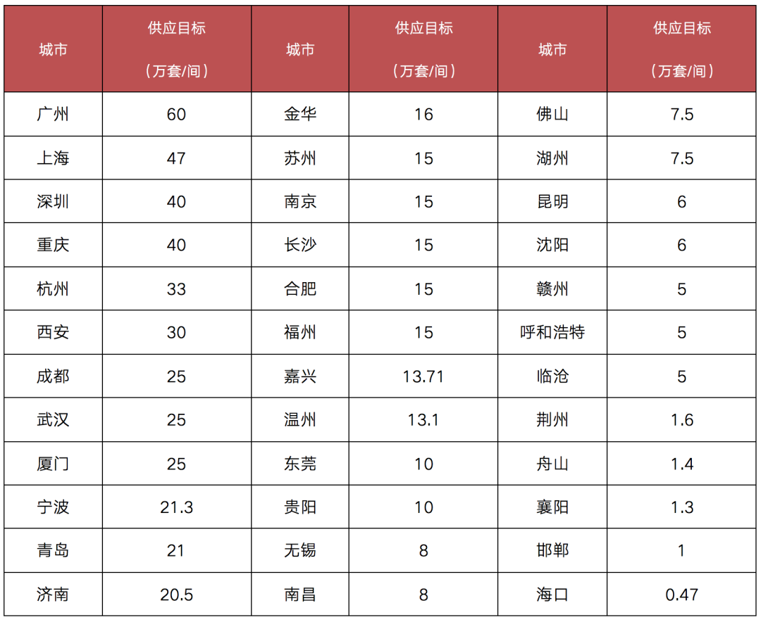 表:部分城市“十四五”時期新增保障性租賃住房供應目標(萬套/間)