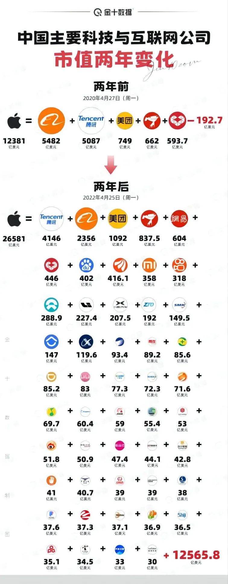 一張是中國主要科技與互聯(lián)網(wǎng)公司的兩年來的市值對比;