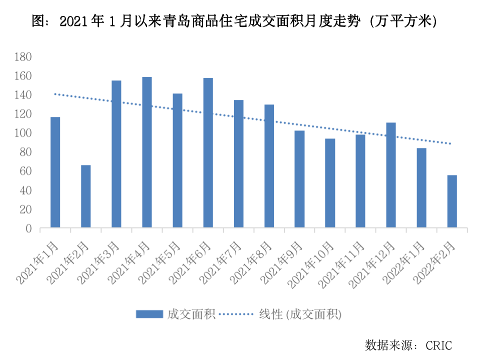 除了由于供地質量不佳外,我們認為青島此次土拍平平的另一大原因在于近期樓市表現較為萎靡。結合新建商品住宅成交規模走勢來看,2021年下半年以來青島的樓市成交明顯遇冷,樓市成交規模下滑趨勢較為明顯,其中2022年1-2月累計成交規模同比降幅達23%。