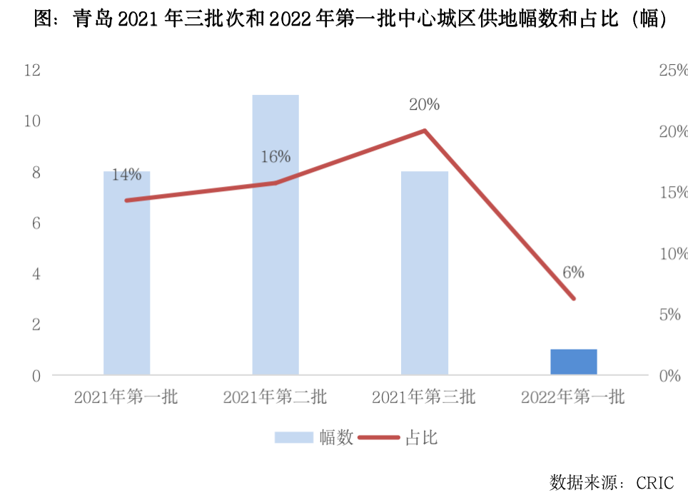 結合區域分布來看,和去年任意批次一樣,青島集中供地的主力仍集中在黃島區,16幅地中有10幅來自黃島區。但中心城區的地塊供應量明顯縮減,此次市南、市北及嶗山等主城區均無地塊供應,僅李滄區推出1幅地,無論是幅數和占比均低于2021年任意批次。