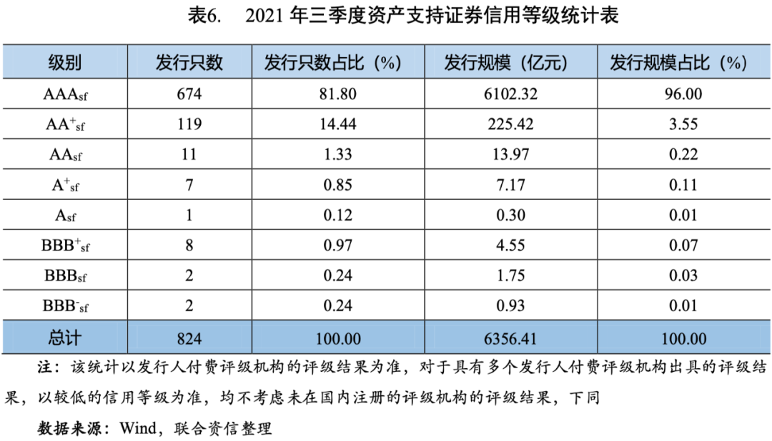 2021年三季度,新發行的資產支持證券中,有824只具有信用評級,總體上集中于AAAsf和AA+sf,AAAsf級資產支持證券的發行只數占比81.80%,發行規模占比96.00%;AA+sf級資產支持證券的發行只數占比約14.44%,發行規模占比約3.55%(見表6)。