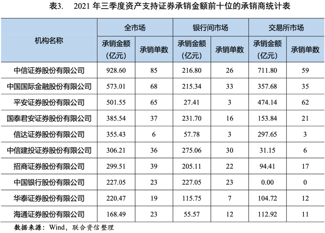 從資產支持證券的承銷情況來看,2021年三季度,中信證券股份有限公司、中國國際金融股份有限公司和平安證券股份有限公司的承銷金額、承銷單數均位居前三位(見表3)。