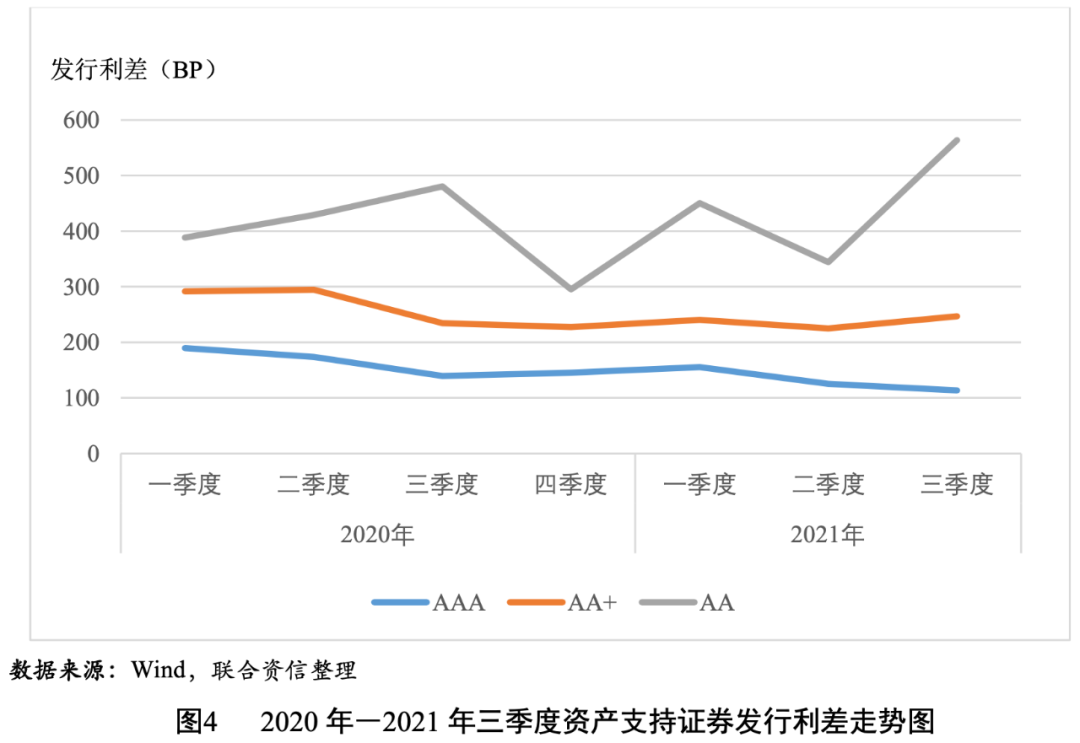 2021年三季度資產支持證券市場規模穩步增長,共發行577單1531只資產支持證券,發行規模7987.01億元,環比和同比均有所上升,其中交易所市場資產支持證券的發行規模環比增幅高于銀行間市場,銀行間ABS發行單數、只數和規模同比增幅較銀行間ABN更高。資產支持證券發行信用等級主要集中于AAAsf和AA+sf,AAAsf、AA+sf和AAsf級資產支持證券的發行利差均值分別為113BP、247BP和564BP,各信用等級利差檢驗均具有顯著差異,信用評級對資產支持證券的信用風險具有良好的區分度。