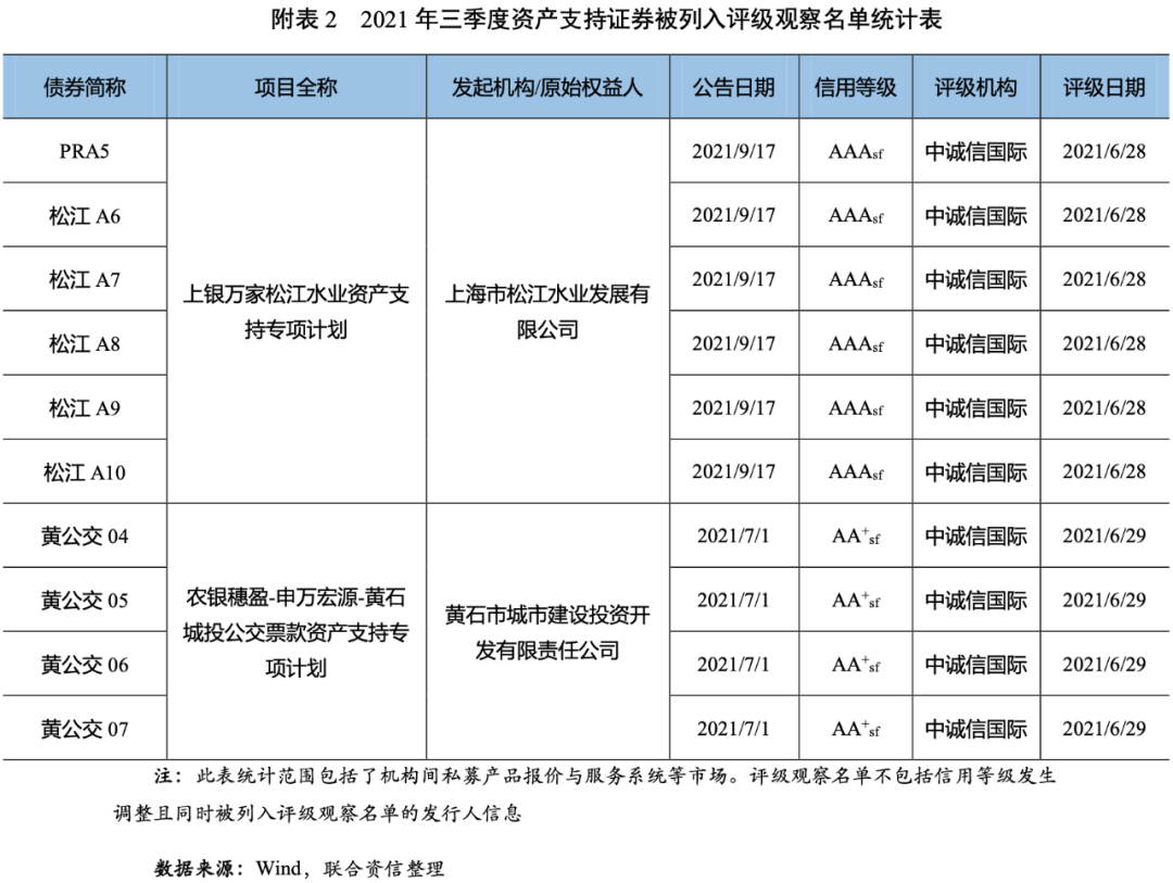 2021年三季度,債券市場上未出現資產支持證券違約;14只資產支持證券信用評級下調(見附表1),同比大幅增加7只;10只資產支持證券被列入評級觀察名單[2](見附表2),同比減少4只。
