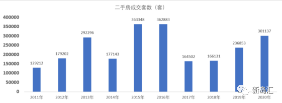 雖然2020年并不是二手房成交量最高的一年,但也絕對不低。2017-2019上海二手房的成交套數(shù)分別是16.5萬套、16.6萬套、23.7萬套,2020年為30萬套。