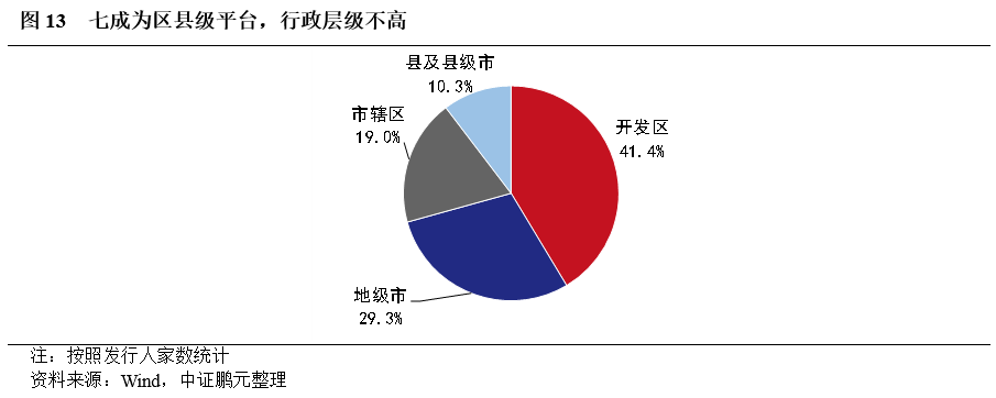 以城投主體的實際業務所在行政層級來看,區縣級(含開發區、市轄區、縣及縣級市)平臺共41家,占比為70.7%,地級市級平臺僅17家,占比29.3%,整體上行政層級偏低(圖13)。再細分區域來看,東部發達地區以區縣級為主,而西部欠發達地區則以地級市為主。這充分反映了市場對于“強地區弱城投、強城投弱地區”信用風險的擔憂。