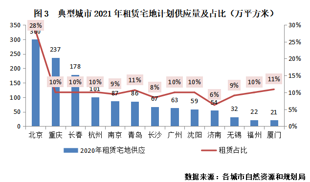 就已經(jīng)發(fā)布2021年供地計(jì)劃的城市來(lái)看,北京表現(xiàn)最為突出。2021年北京市土地供應(yīng)計(jì)劃中明確租賃住房用地供應(yīng)指標(biāo)為300公頃,其占住宅用地的比重由2020年的13%大幅提高到28%,無(wú)論是租賃住房量還是占比均居于首位(截止4月21日,上海尚未公布2021年建設(shè)用地供地計(jì)劃,不過(guò)上海政府工作報(bào)告中提到,2021年將形成5.3萬(wàn)套的租賃住房供應(yīng),供地力度也比較大)。