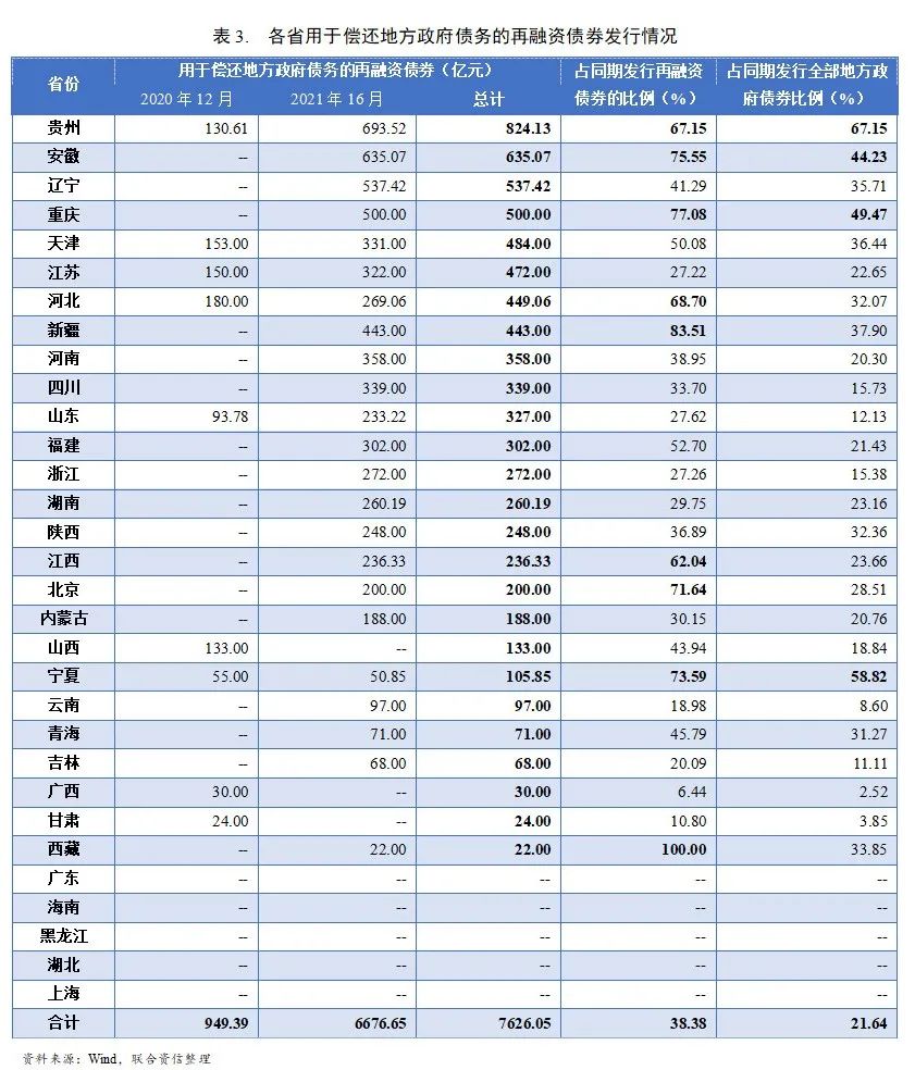 截至2021年6月末,貴州發行用于償還地方政府債務再融資債券的規模最大,高達824.13億元,占該省同期(2020年12月及2021年上半年)發行再融資債券的比例為67.15%,占該省期間發行全部地方政府債券的67.15%。安徽、遼寧、重慶、天津、江蘇、河北、新疆等省份發行規模亦不小,均在400億元以上。