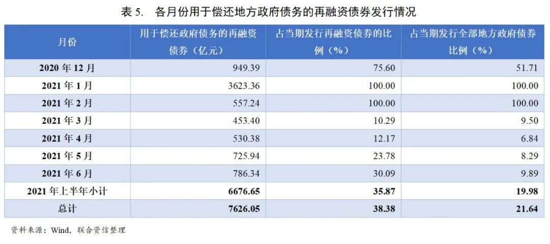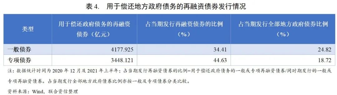 2020年12月及2021年上半年,用于償還政府債務的一般債券和專項債券分別為4177.93億元和3448.12億元,分別占同期發行再融資債券的比例為34.41%和44.63%,分別占同期發行全部地方政府債券的比例為24.82%和18.72%。化債用途專項債券在再融資債券中的占比相對較高,或由于地方政府隱性債務的認定通常需要保證債務與公益性項目資產相對應,因此用于項目投資的專項債券或更適合對非債券形式的債務進行置換。