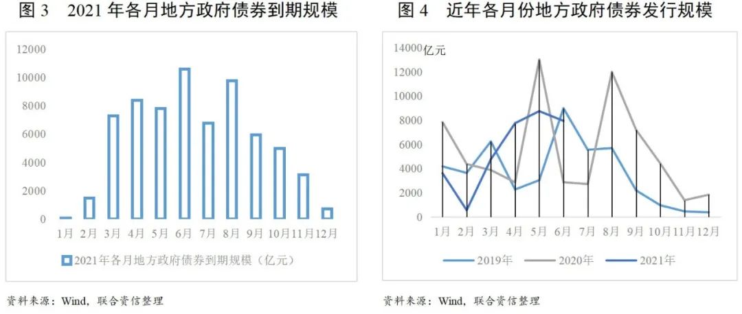 從地方政府債券發行月份來看,2021年1月為“用于償還地方政府存量債務”再融資債券的集中發行期間,全月發行3623.36億元再融資債券,全部用于償還地方政府存量債務,或與當月地方政府債券到期規模小有關(圖3)。隨后,化債用途再融資債券發行規模逐月減少,在當期發行的再融資債券比例及當期發行的全部地方政府債券比例亦降低。2021年5月及6月化債用途再融資債券發行規模回升,占當期發行再融資債券的比例也有所回升。根據2019年至今各月份地方政府債券發行情況看,每年5至9月為地方政府債券發行高峰(圖4),按現有規模及比例看,預期2021年下半年仍有較大規模再融資債券用于緩解地方政府債務壓力。