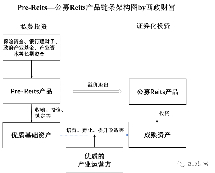 在上述架構中,Pre-Reits聯合諸如保險資金、銀行理財子資金、政府產業投資基金、產業資本等長期資金共同成立Pre-Reits私募股權投資基金,在一級市場提前鎖定優質資產(產業運營方若有優質的基礎資產,亦可納入相關的資產池),資金用于優質項目的新建或存量優質項目的收購,并綁定產業運營方深度合作。產業運營方通過將基礎資產培育、孵化、提升改造成為成熟資產,在資產達到發行標準后,將項目資產打包為資產支持專項計劃并出售給Reits,并獲取一級市場股權投資及二級資本市場溢價退出的高額投資回報。