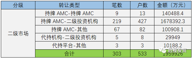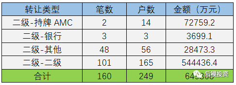二級投資機構共受讓824戶,受讓金額250億余元。其中持牌AMC-二級投資機構為主要受讓來源,占三級受讓市場66%。相較2018年,二級投資機構債權受讓市場保持穩定,受讓金額相差不大。