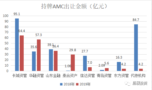 二級市場中,2019年長城資管與華融資管穩居前兩名,出讓金額都在60億元上下,山東金融這兩年出讓金額穩定在40億元左右,相比2018年,泰和資管與信達資管、代持機構表現截然相反,分別大幅增多和減少。