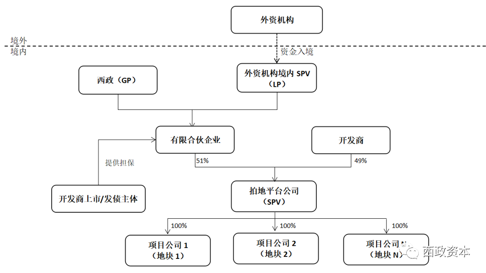 從當前的市面融資情況來看,2020年11月房企境內外發債規模環比增長率超過了50%,部分中小房企境外發債利率突破了年化14%,另外2021年也將迎來還債高峰期。從房企的存量發債情況來看,目前總體上是借新還舊的多(尤其是境外發債)。從新增融資的路徑來看,房企2021年的增量融資主要得轉入兩個方向:第一個是真股融資或明股實債類融資,這是在“三道紅線”下房企表內債壓降背景下的必然選擇;第二個權益類融資,比如房企的商業、辦公類物業所涉的資產收益權、租金收益權融資,房企的工程材料應付賬款、購房尾款、物業管理應收賬款等對應的供應鏈ABS或其他收益權類產品融資等。需要注意的是,目前上交所、深交所對于ABS產品的發行只允許存量發行,增量相對困難,但是保交所目前發行前述產品還存在增量的空間。此外,北金所的債權計劃對于發行主體不要求強制外部評級、資金用途和使用期限靈活、項目準入相對寬松、業務辦理流程簡單,目前已逐漸受到房企的青睞。除上述主流融資方式外,境外融資將成為不少房企更好的融資選擇,比如外資比較喜歡的土地競拍保證金資金池融資業務,房企境外發行的364天的美元債,帶外資招商任務的土地款融資等(指山東、江蘇等地為代表的FDI類融資,具體可參見下述融資架構)。