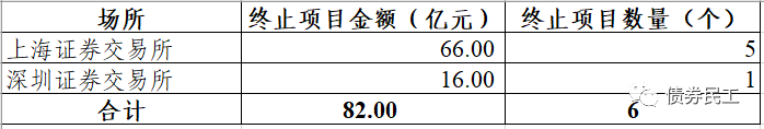 2022年4月終止的債券項目(小公募、私募債和ABS)金額合計為82億元,終止項目數量6個。其中上海證券交易所終止金額為66億元,占比為80.49%;深圳證券交易所終止金額為16億元,占比為19.51%。