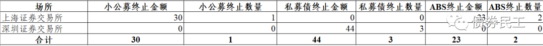 從ABS產品來看,單只債券最大終止金額為22億元,為長城證券-合生財富廣場資產支持專項計劃。最小終止金額為1億元,為國金-中關村擔保科技型中小微企業供應鏈1-10號資產支持專項計劃。