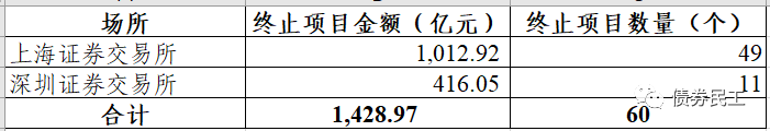 2022年3月終止的債券項目(小公募、私募債和ABS)金額合計為1,428.97億元,終止項目數量60個。其中上海證券交易所終止金額為1,012.92億元,占比為70.88%;深圳證券交易所終止金額為416.05億元,占比為29.12%。