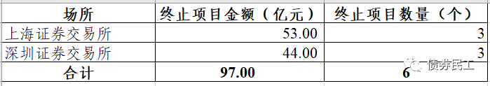 分交易所情況來看,上海證券交易所終止金額為53億元,占比為54.64%;深圳證券交易所終止金額為44億元,占比為45.36%。從終止債券數量來看,上交所和深交所均終止了3只債券。
