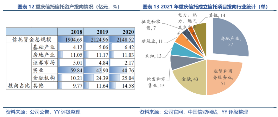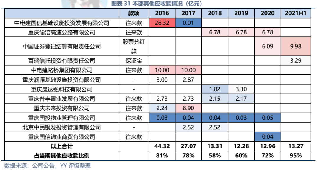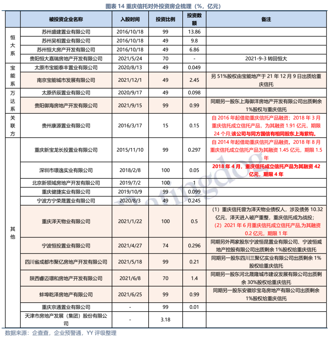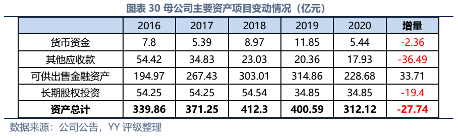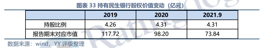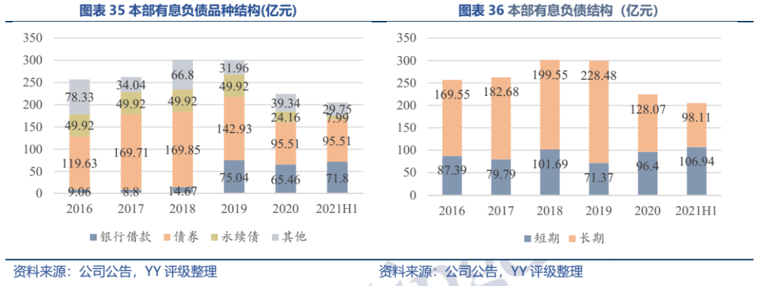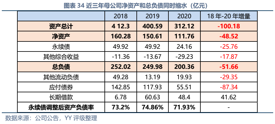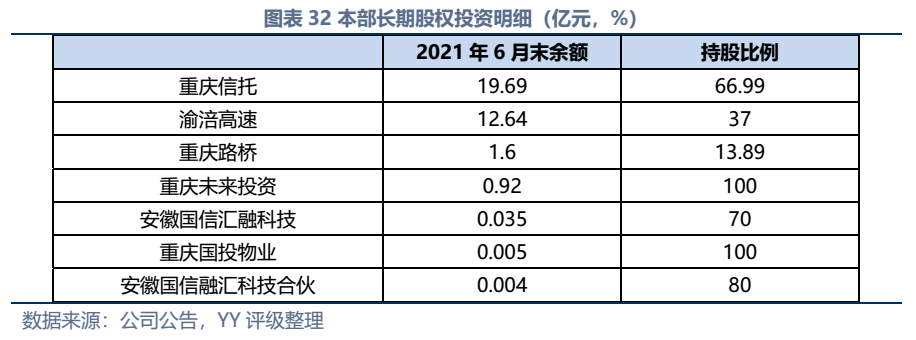 因同方國信子公司獨立性較強,我們主要梳理了本部的資產(chǎn)以及測算了債務(wù)壓力和短償債能力。資產(chǎn)方面,以信托投資(交易性金融資產(chǎn)103億元主要為信托投資)、民生銀行股票(最新市值約73億元,已質(zhì)押,2019年來市值縮水37%)、重慶信托67%股權(quán)(賬面以成本法計量僅20億元,但按重慶信托最新凈資產(chǎn)計量則價值282億元)為主;債務(wù)方面,19年以來,本部有息債務(wù)水平有所降低(主要通過可供出售金融資產(chǎn)變現(xiàn)償還),截至21年中,有息債務(wù)205億元,短債107億元,22年將有64億元債券到期或行權(quán),短債壓力較大。測算短期可變現(xiàn)資源,預(yù)計短期內(nèi)變現(xiàn)能力比較確定的僅約22億元,要覆蓋22年內(nèi)到期或行權(quán)的64億元債券還有較大缺口,可能需要關(guān)注信托投資資產(chǎn)或者牌照的價值(比較難及,且由于重慶信托股權(quán)不可質(zhì)押,且前文所描述,重慶信托的真實控制權(quán)在新渝富的持股鏈條上,同方國信更多是居于財務(wù)投資這一角色,可能如果臨時出現(xiàn)兌付危機,假設(shè)重慶信托的資產(chǎn)質(zhì)量仍有支持,股權(quán)仍有較高價值)。