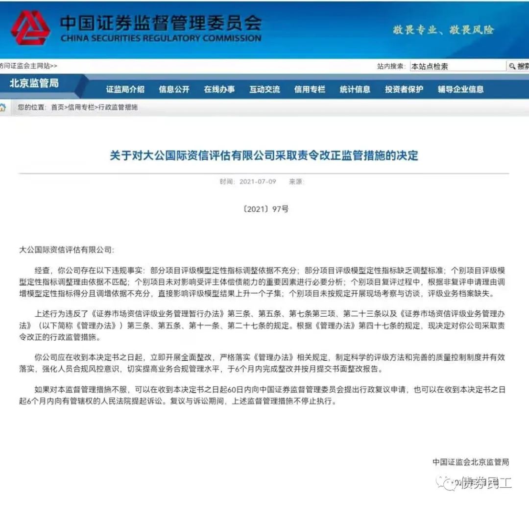 根據(jù)中國(guó)證監(jiān)會(huì)北京監(jiān)管局2021年7月9日披露的信息,大公國(guó)際資信評(píng)估有限公司(以下簡(jiǎn)稱(chēng)“大公國(guó)際”)被采取責(zé)令改正監(jiān)管措施,主要原因是部分項(xiàng)目評(píng)級(jí)模型定性指標(biāo)調(diào)整依據(jù)不充分、缺乏調(diào)整標(biāo)準(zhǔn)等,要求于6個(gè)月內(nèi)完成整改并提交書(shū)面整改報(bào)告。