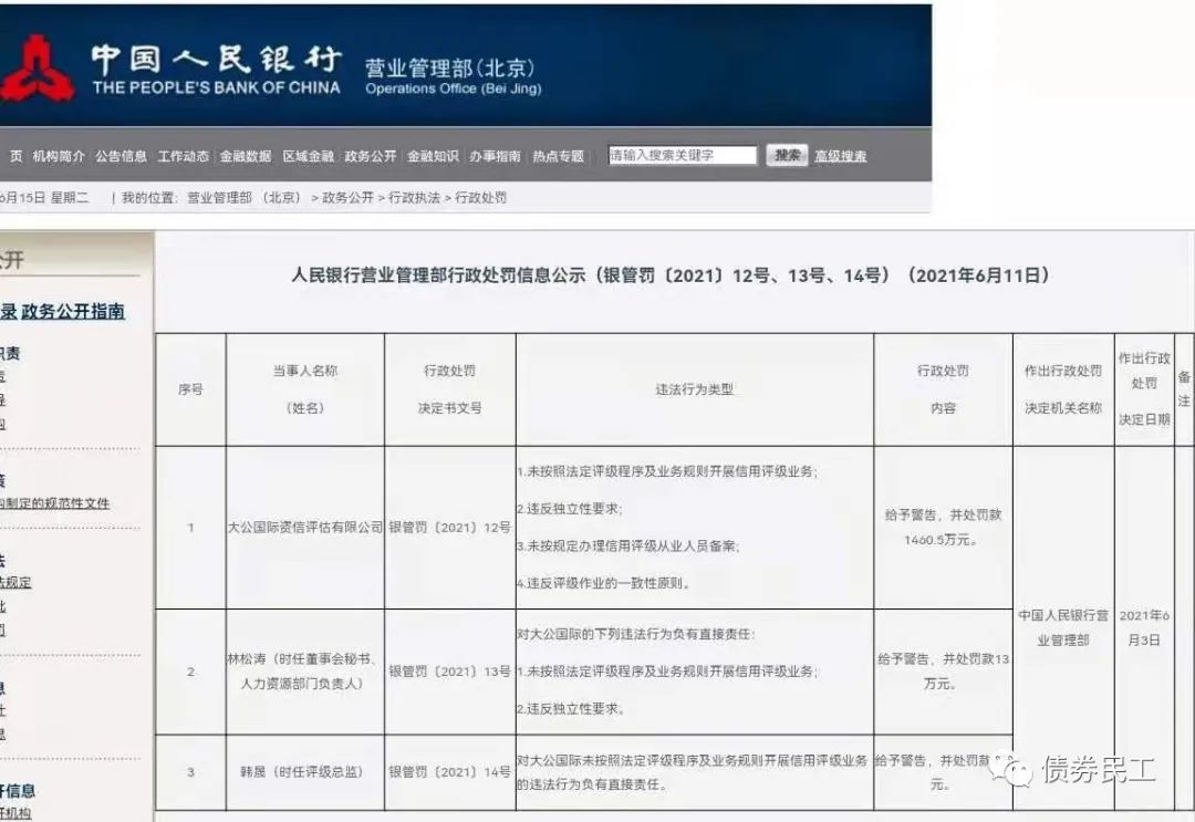 這是大公國(guó)際2021年第二次收到評(píng)級(jí)監(jiān)管機(jī)構(gòu)的處罰了。此前根據(jù)中國(guó)人民銀行營(yíng)業(yè)管理部2021年6月的公告,大公國(guó)際被罰款1460.50萬(wàn)元,主要原因是未按照法定程序開(kāi)展評(píng)級(jí)業(yè)務(wù)、違反獨(dú)立性要求和違反評(píng)級(jí)作業(yè)的一致性原則等。值得注意的是,中國(guó)人民銀行營(yíng)業(yè)管理部的在此次觸發(fā)中,被處罰人還包括大公國(guó)際的評(píng)級(jí)總監(jiān)和董事會(huì)秘書(shū)。