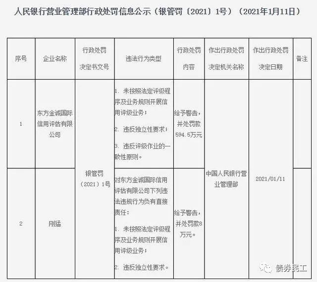 3、中國(guó)人民銀行營(yíng)業(yè)管理部于2021年1月11日對(duì)東方金誠(chéng)給予警告并罰款594.5萬(wàn)元,主要原因是未按照法定評(píng)級(jí)程序及業(yè)務(wù)規(guī)則開(kāi)展信用評(píng)級(jí)業(yè)務(wù)、違反獨(dú)立性要求和違反評(píng)級(jí)作業(yè)的一致性原則。