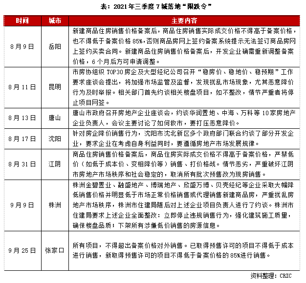 出于穩(wěn)房價、穩(wěn)預期的需要,岳陽、昆明等7城相繼落地“限跌令”。其中,岳陽、江陰明文規(guī)定禁止大幅降價,昆明、唐山、沈陽、株洲采取約談的方式,禁止房企、中介機構(gòu)惡意降價、打價格戰(zhàn),擾亂房地產(chǎn)市場秩序。