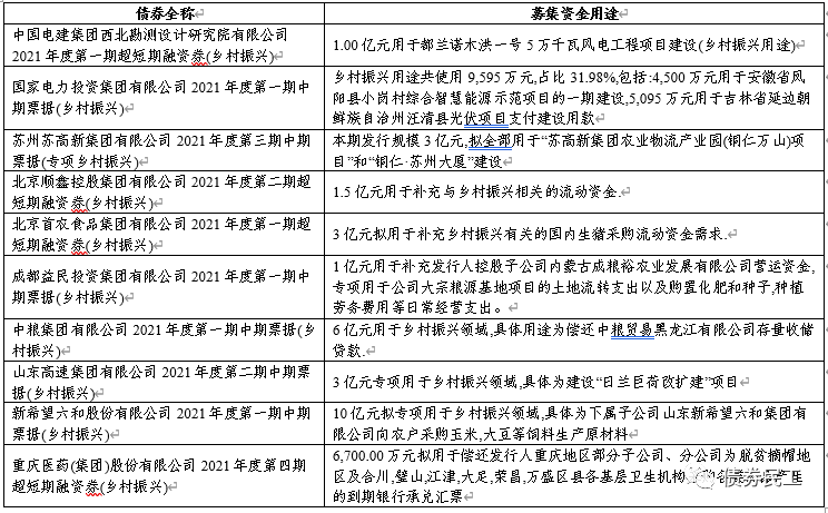 自2021年3月16日,重慶醫(yī)藥(集團(tuán))股份有限公司2021年度第四期超短期融資券(鄉(xiāng)村振興)作為第一只鄉(xiāng)村振興票據(jù)面世以來(lái),鄉(xiāng)村振興票據(jù)受到的關(guān)注越來(lái)越多。2021年3月19日,銀行間市場(chǎng)交易商協(xié)會(huì)通過(guò)官方微信公眾號(hào)發(fā)布了《債務(wù)融資工具注冊(cè)發(fā)行業(yè)務(wù)問(wèn)答(第8期)》(以下簡(jiǎn)稱(chēng)“《問(wèn)答》”),對(duì)鄉(xiāng)村振興票據(jù)的實(shí)施細(xì)則進(jìn)行了明確,確認(rèn)募集資金投向分別對(duì)應(yīng)的是農(nóng)民就業(yè)增收項(xiàng)目、農(nóng)業(yè)現(xiàn)代化建設(shè)項(xiàng)目和農(nóng)村鄉(xiāng)村建設(shè)三大領(lǐng)域。