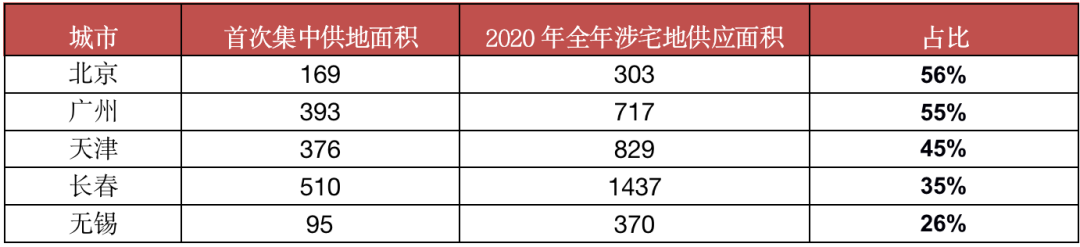 從首批已經(jīng)集中供地的5個城市來看,除無錫外,其余四城供應(yīng)均十分“給力”,占2020年全年宅地供應(yīng)面積的比重均超35%,尤其是北京和廣州,分別為56%和55%,較2020年已過半,其次是天津,比重也達(dá)45%。總體供地節(jié)奏快于往年同期平均值。