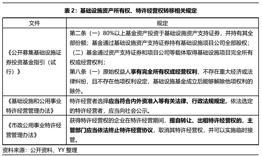 而對于基礎資產所有權和經營權的規定,主要矛盾點在于業內對于基建領域中特許經營的內涵和外延尚未達成共識,在目前相關部委發布的特許經營協議示范文本及很多法規,如上表的國家發改委、財政部等六部委2015年聯合頒布的《基礎設施和公用事業特許經營管理辦法》以及住建部頒布的《市政公用事業特許經營管理辦法》中,都存在限制通過股權轉讓實現經營權轉讓的條款或規定。