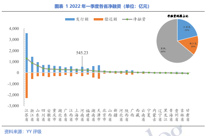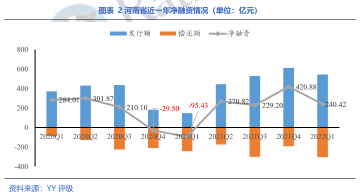 2022年一季度,全國城投債發行額13,728.97億元,償還額7,647.97億元,凈融資6,081.00億,其中河南省城投債發行額545.23億元,償還額304.81億元,凈融資240.42億元,占全國凈融資規模的3.9%,位居第十一。