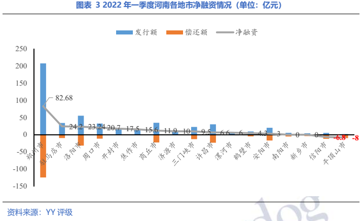 從省內各地級市2022年一季度凈融資情況來看,17個地級市分化明顯。省會鄭州凈融資額領先于其他地市,Q1實現凈融資82.68億,占全省的34.4%,相較于去年同期(-47.79億元)增長明顯。駐馬店、洛陽、周口、開封、焦作、商丘、濟源處于第二梯隊,凈融資額在10億元以上。三門峽、許昌、漯河、鶴壁、安陽處于第三梯隊,凈融資額為正但均在10億元以下。南陽、新鄉兩市新發行與償還額持平,而信陽、平頂山市凈融資為負,處于第四梯隊。