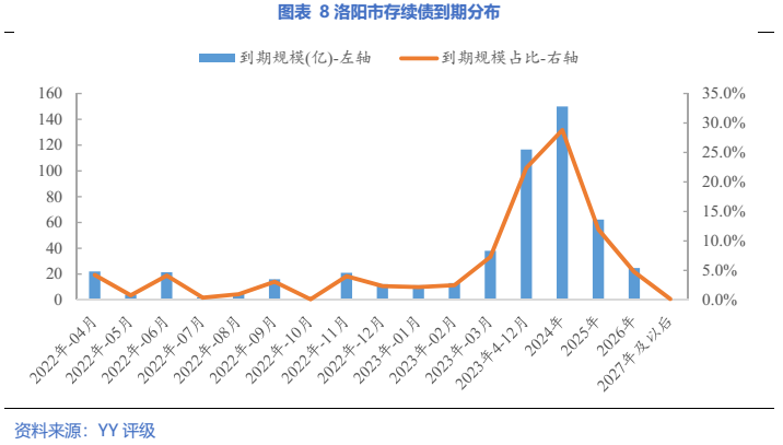 細分到地級市來看:截至2022年3月末(下同)鄭州市存續債1,353.96億元,其中一年內到期金額為430.4億元,占比為31.79%,下圖來看,每個月償還的絕對數額不大;另外洛陽市2023年底前到期的債券占比超過23.1%,償債壓力較為集中。